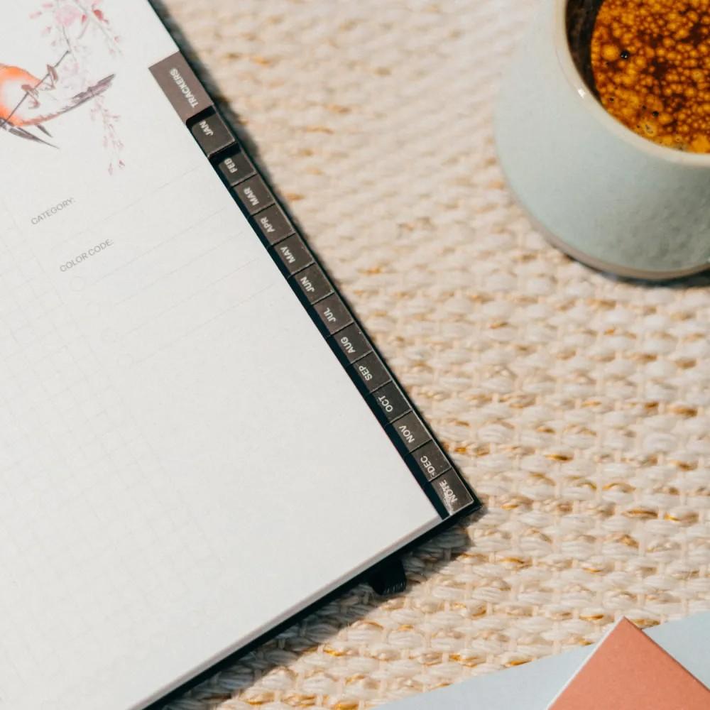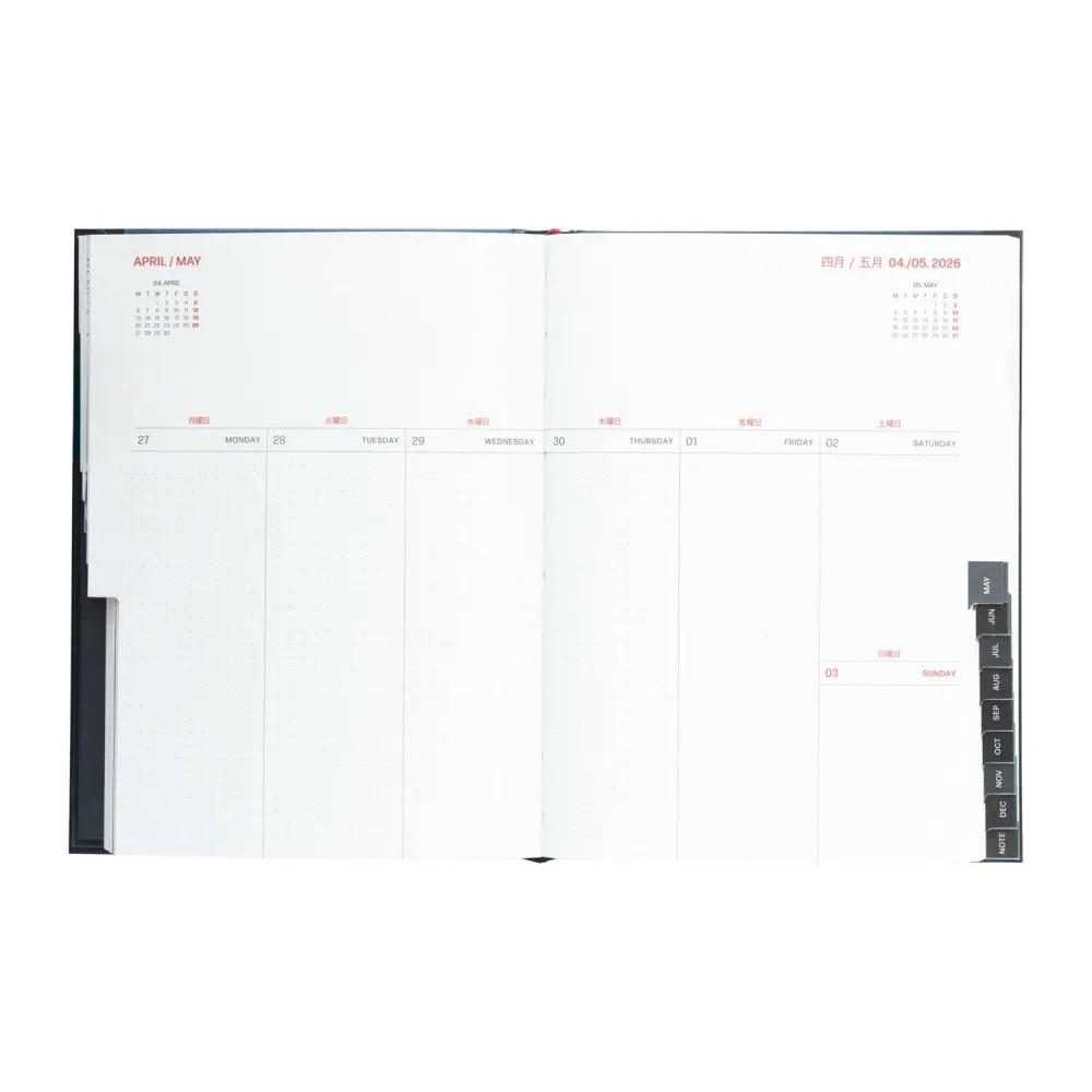 Formato 14,4 x 20 cm, semana vista. Cubierta de tapa dura en papel kraft con encuadernación encolada en frío (apertura 180°).