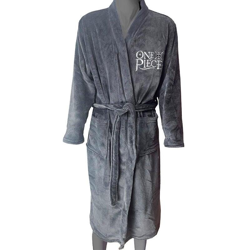 Surca los mares con comodidad con esta bata estilo albornoz de One Piece, perfecta para los verdaderos nakamas. De color gris oscuro y con el logo bordado de One Piece junto a la insignia pirata negra, combina estilo y calidez en una prenda imprescindible para el descanso.